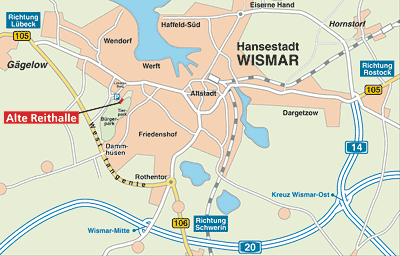 An der „Alten Reithalle“ stehen ausreichende Parkflächen zur Verfügung (Zum Festplatz, 23966 Wismar). Mit dem städtischen Nahverkehr (EVB Wismar) ist die „Alte Reithalle“ über die Linien A und G (Haltestelle „Tierpark“) zu erreichen. Alte Reithalle bei Google Maps ansehen